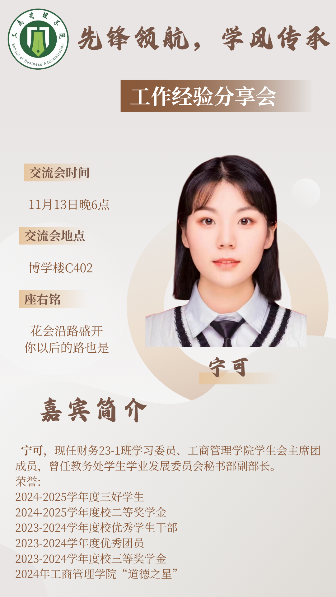 为深入贯彻“先锋领航,学风传承”的理念,引导同学们在学业与工作中稳步前行,工商管理学院“先锋领航,学风传承”系列宣讲之“工作分享交流会”将在11月11日、13日举行。本次活动邀请到两位优秀学长学姐,为大一同学们分享他们在学生工作与个人成长中的宝贵经验。