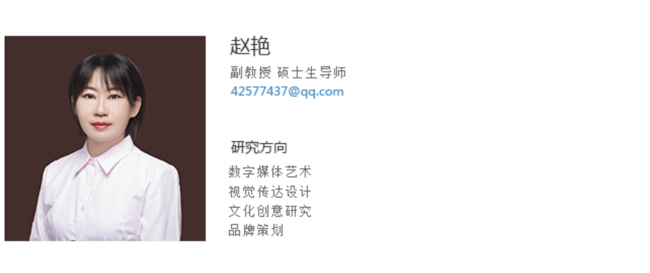 赵艳副教授,大连工业大学设计学硕士。曾担任中国大学生广告艺术节学院奖评委;多年从事文化创意设计领域研究,出版《中国传统文化创意设计》等著作;撰写文化创意设计相关论文多篇;《中华优秀传统文化的创造性转化与创新性发展研究》等多项文化研究课题获批辽宁省社会科学规划基金等立项,相关教改课题获批国家教育部产学合作育人项目;指导学生获大学生创新创业训练省级项目4项;获靳埭强全球华人设计大奖银奖、全国公共机构节能宣传大赛二等奖;全国大学生广告艺术大赛国家级一等奖、二等奖、三等奖多次;中国大学生计算机大赛二等奖、三等奖多次;红色文化创意大赛等赛事等级奖多项;曾获辽宁省教育软件大赛高教组二等奖、三等奖,全国多媒体课件大赛一等奖、三等奖;辽宁省信息化教育大赛微课组三等奖;校级优秀教案大赛一等奖;校级课堂教学大赛一等奖;校级教学改革与教学建设成果二等奖 ;首届考试方式方法改革试点课程优秀成果一等奖;买球赛的网站第五届“名师示范课”主讲教师;校园先锋工程教学先锋岗;校级教学质量优秀奖。