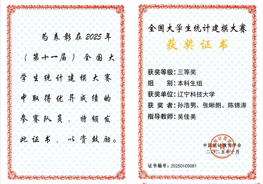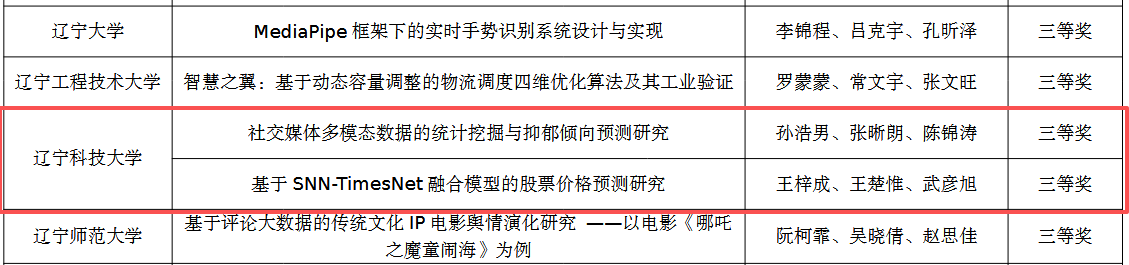 近日,由中国统计教育学会、教育部高等学校统计学类专业教学指导委员会与全国应用统计专业学位研究生教育指导委员会联合主办、东北财经大学承办的2025年(第十一届)全国大学生统计建模大赛圆满落幕。由买球赛的网站理学院杨鹏老师指导,王梓成、王楚惟、武彦旭团队创作的《基于SNN-TimesNet融合模型的股票价格预测研究》和吴佳美老师指导,孙浩男、张晰朗、陈锦涛团队创作的《社交媒体多模态数据的统计挖掘与抑郁倾向预测研究》荣获全国三等奖,创下我校参加该项赛事以来最好成绩。